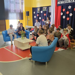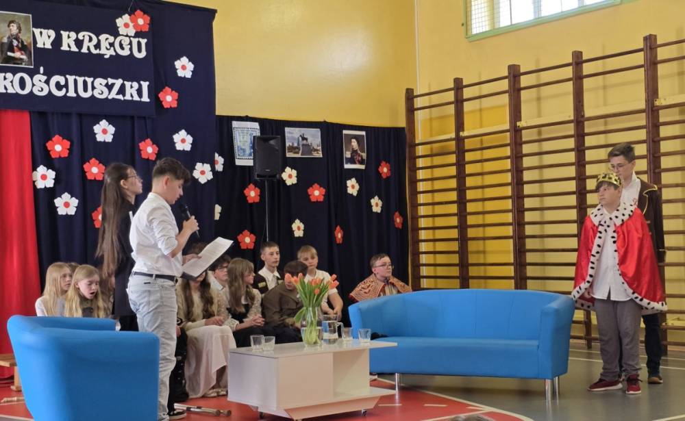 30 kwietnia 2025r. w naszej szkole odbył się uroczysty apel z okazji Dnia Patrona i Święta Konstytucji 3 Maja. Uczniowie zaprezentowali program artystyczny w postaci wywiadu telewizyjnego "W kręgu Kościuszki". Na scenie widzowie zobaczyli Tadeusza Kościuszkę, Stanisława Augusta Poniatowskiego i wiele inny postaci związanych z życiem naszego patrona lub miejscami jego upamiętnień.