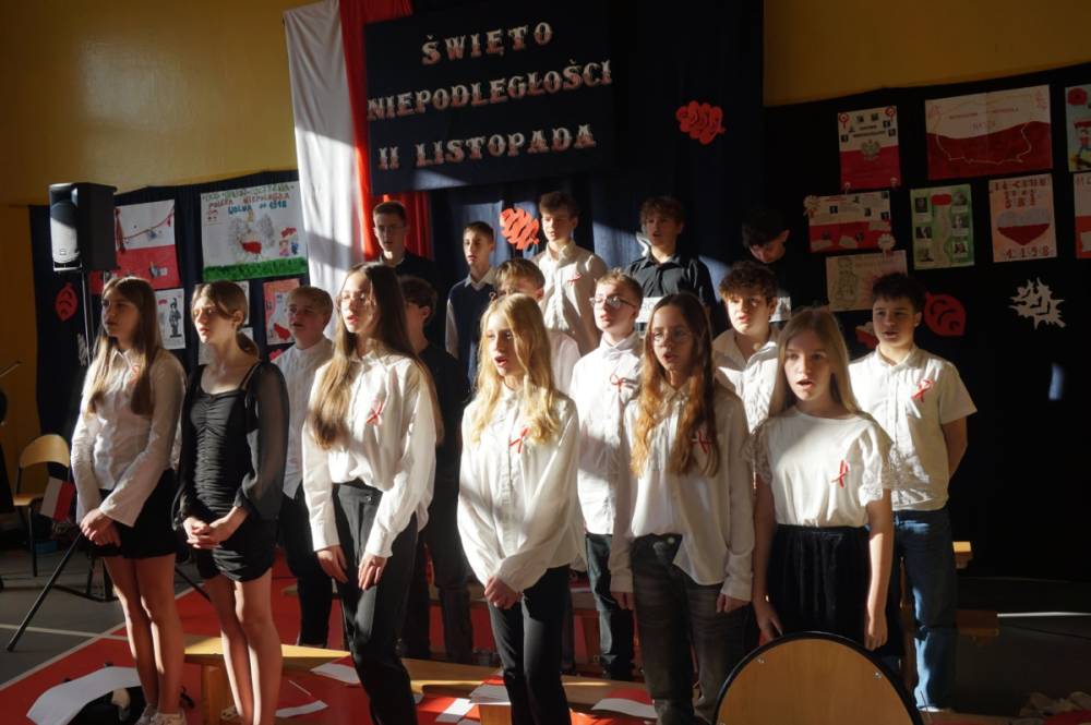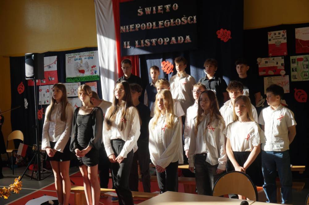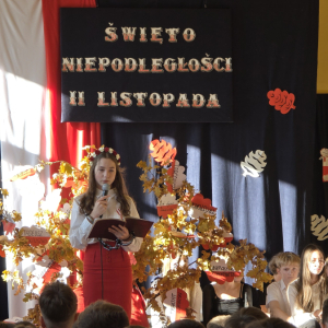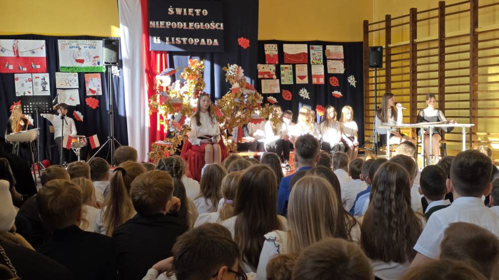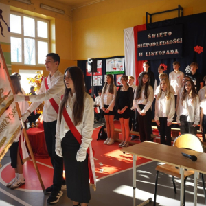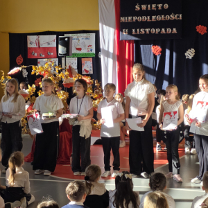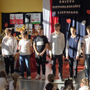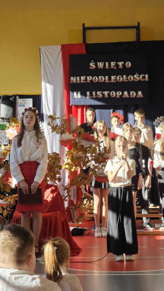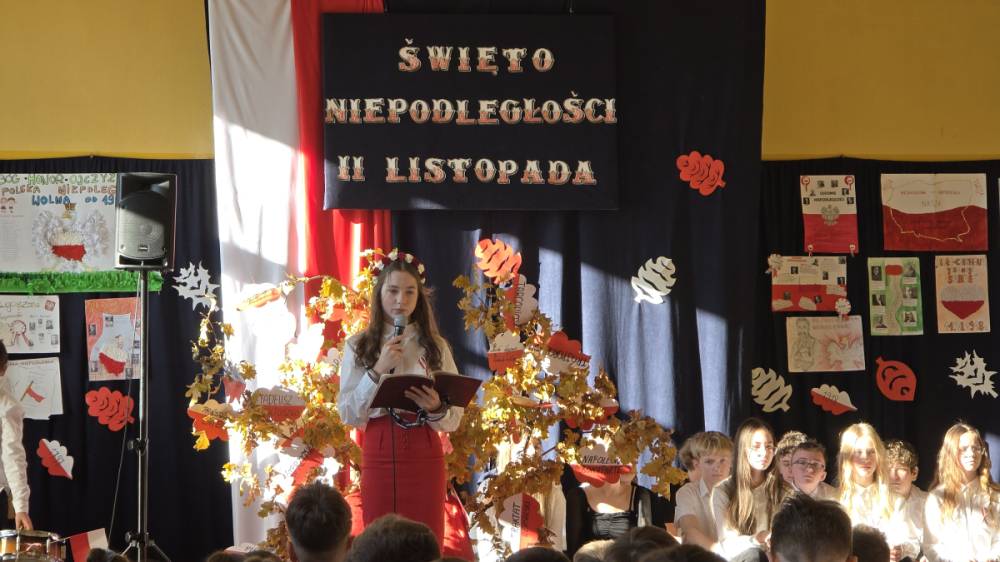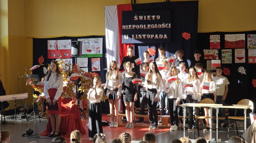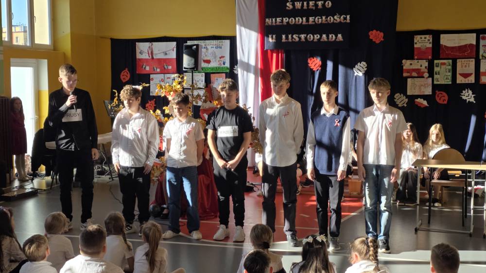 W tym roku 11 listopada obchodzimy 107 rocznicę odzyskania przez Polskę Niepodległości. Podczas uroczystej akademii, która odbyła się w naszej szkole, uczniowie klasy 7a wraz z wychowawczynią p. Jagodą Zając w piękny i oryginalny sposób przedstawili losy narodu polskiego: powstanie państwa, słynne bitwy, rozbiory, zrywy niepodległościowe, wybuch I wojny światowej i nadzieje Polaków na odzyskanie wolności, wreszcie powrót na mapę Europy jako niepodległego i suwerennego kraju. Uczniowie zaprezentowali również losy Polski po 1918 roku, nawiązując do wybuchu II wojny światowej oraz do czasów powojennych. Gabriela Woźniak - uczennica kl. 8b przygotowała wyjątkową recytację autorskiego patriotycznego utworu inspirowanego” Kamieniami na szaniec”