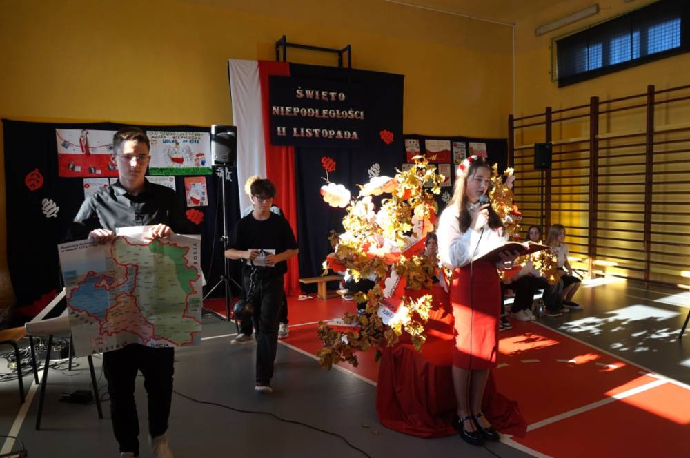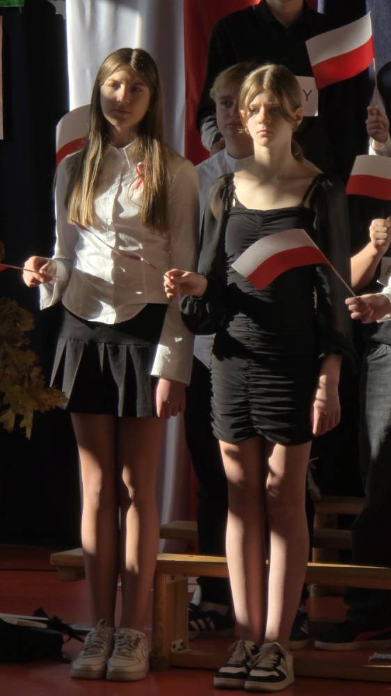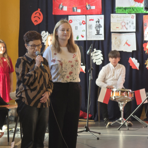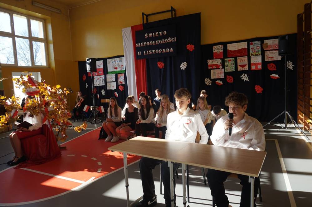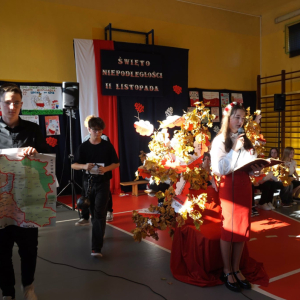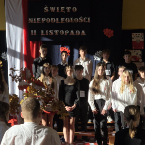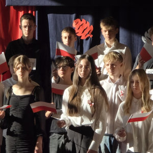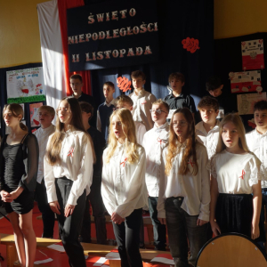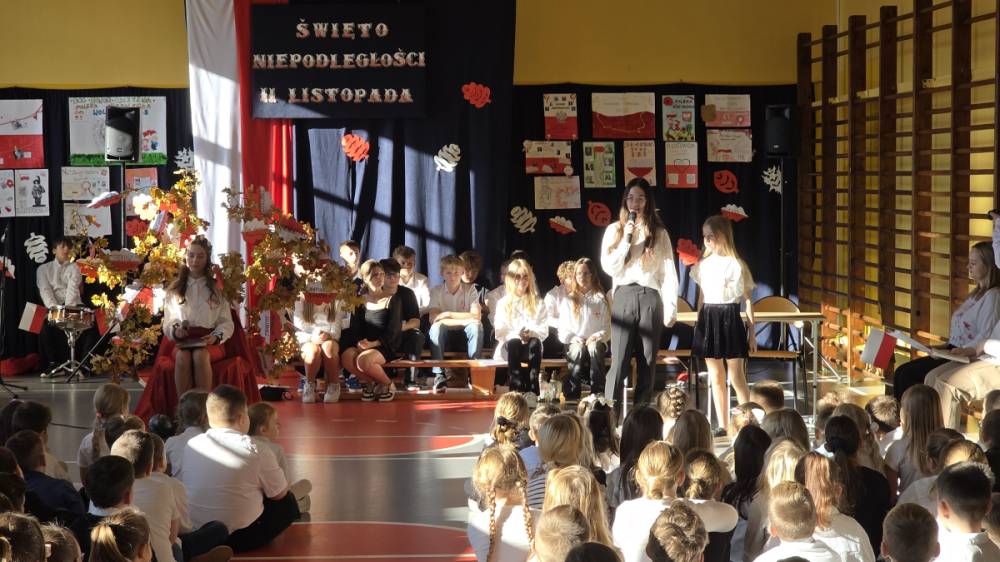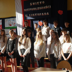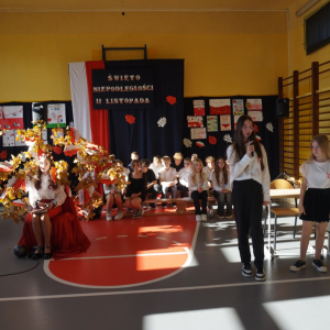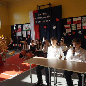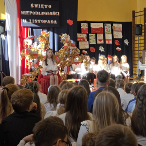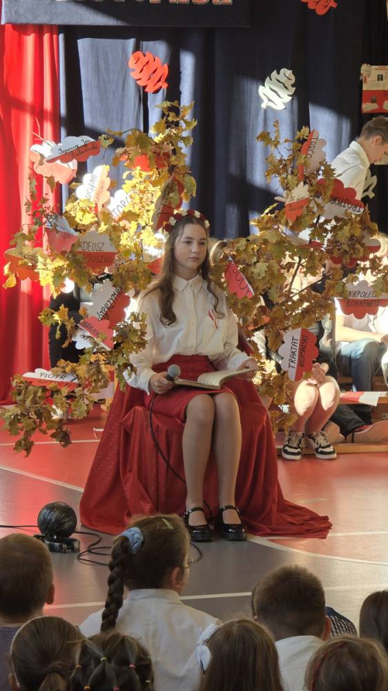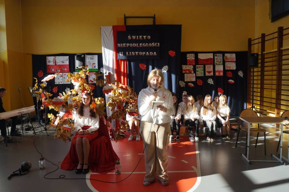 W tym roku 11 listopada obchodzimy 107 rocznicę odzyskania przez Polskę Niepodległości. Podczas uroczystej akademii, która odbyła się w naszej szkole, uczniowie klasy 7a wraz z wychowawczynią p. Jagodą Zając w piękny i oryginalny sposób przedstawili losy narodu polskiego: powstanie państwa, słynne bitwy, rozbiory, zrywy niepodległościowe, wybuch I wojny światowej i nadzieje Polaków na odzyskanie wolności, wreszcie powrót na mapę Europy jako niepodległego i suwerennego kraju. Uczniowie zaprezentowali również losy Polski po 1918 roku, nawiązując do wybuchu II wojny światowej oraz do czasów powojennych. Gabriela Woźniak - uczennica kl. 8b przygotowała wyjątkową recytację autorskiego patriotycznego utworu inspirowanego” Kamieniami na szaniec”