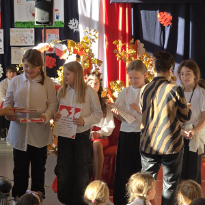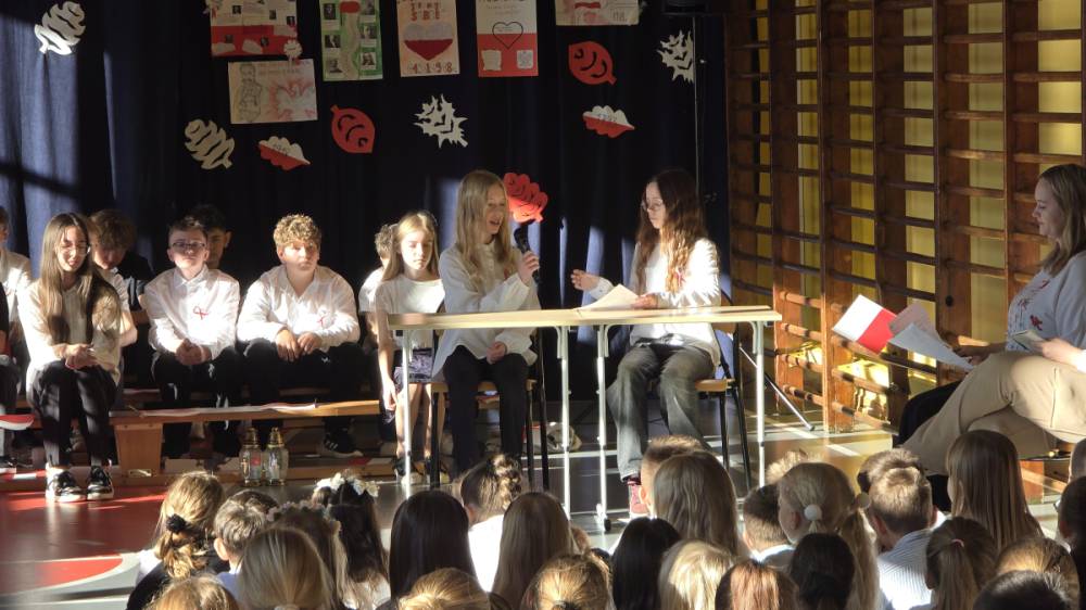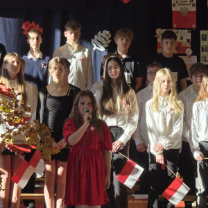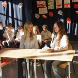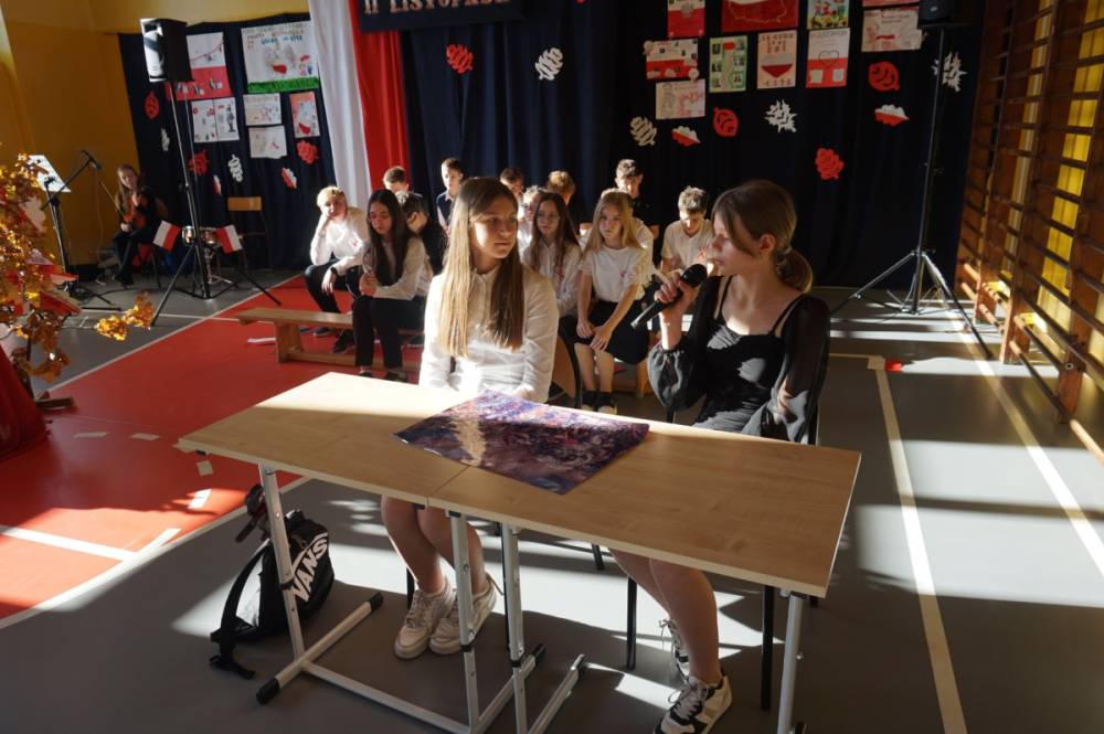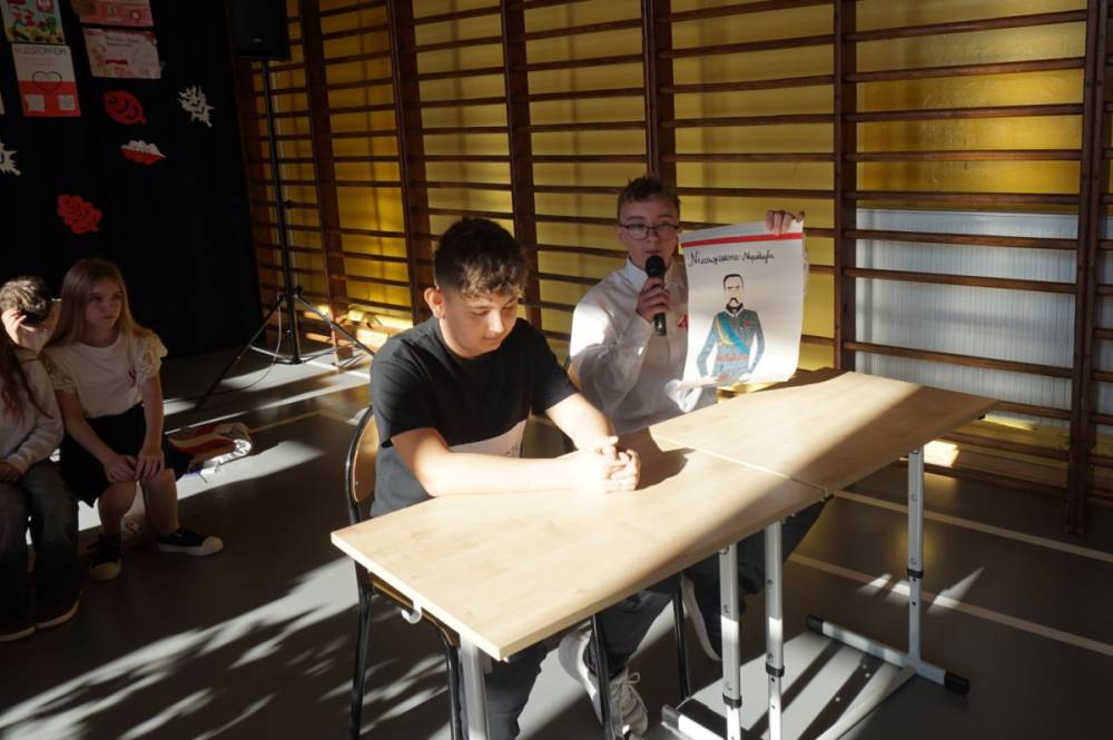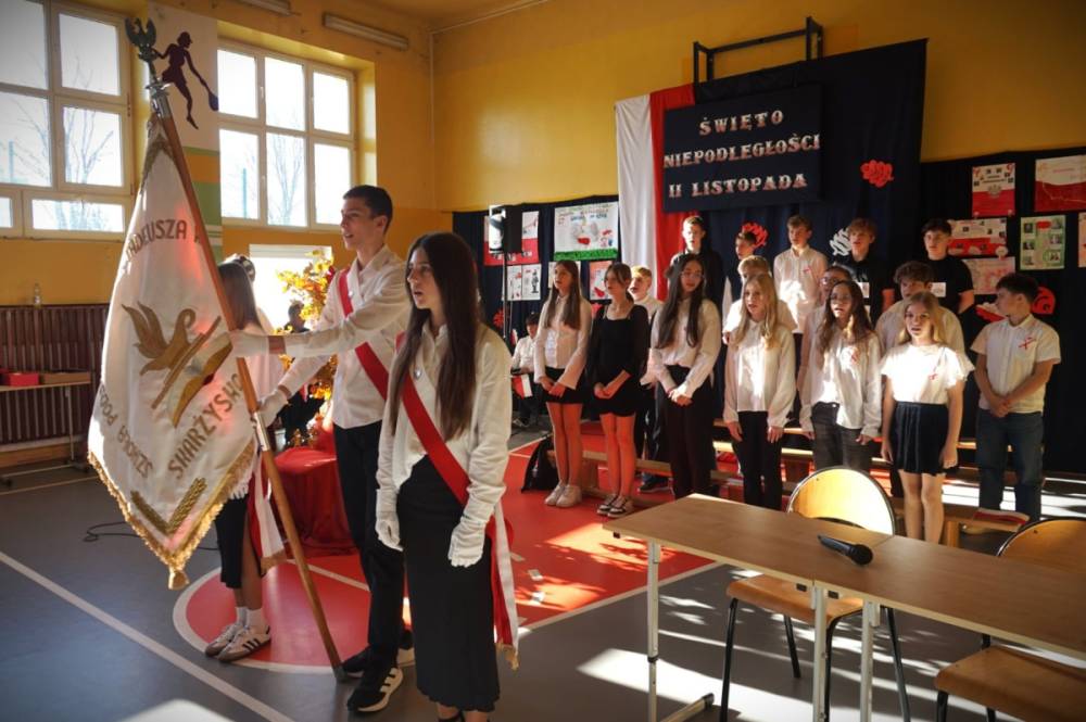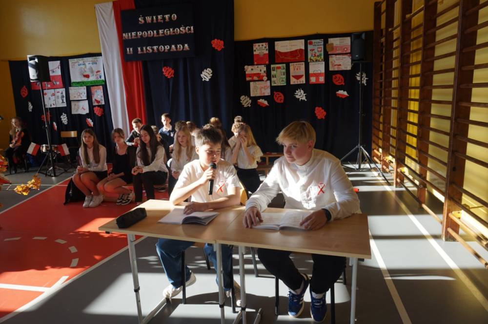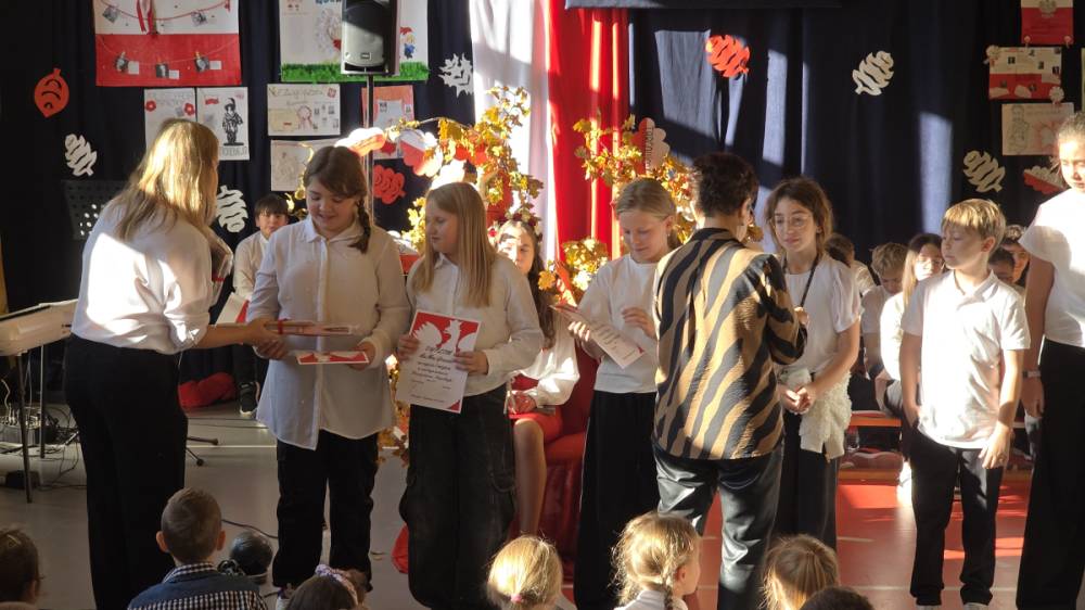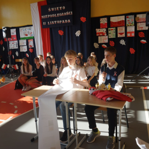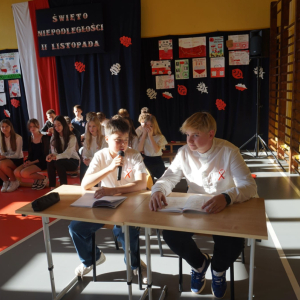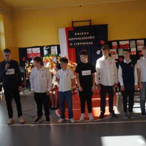 W tym roku 11 listopada obchodzimy 107 rocznicę odzyskania przez Polskę Niepodległości. Podczas uroczystej akademii, która odbyła się w naszej szkole, uczniowie klasy 7a wraz z wychowawczynią p. Jagodą Zając w piękny i oryginalny sposób przedstawili losy narodu polskiego: powstanie państwa, słynne bitwy, rozbiory, zrywy niepodległościowe, wybuch I wojny światowej i nadzieje Polaków na odzyskanie wolności, wreszcie powrót na mapę Europy jako niepodległego i suwerennego kraju. Uczniowie zaprezentowali również losy Polski po 1918 roku, nawiązując do wybuchu II wojny światowej oraz do czasów powojennych. Gabriela Woźniak - uczennica kl. 8b przygotowała wyjątkową recytację autorskiego patriotycznego utworu inspirowanego” Kamieniami na szaniec”